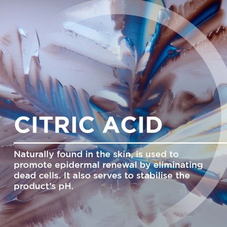 La fórmula está complementada con AHA (ácido cítrico) y microperlas* para exfoliar con suavidad y eliminar las impurezas. Suaviza la tez y devuelve la luminosidad a la piel.